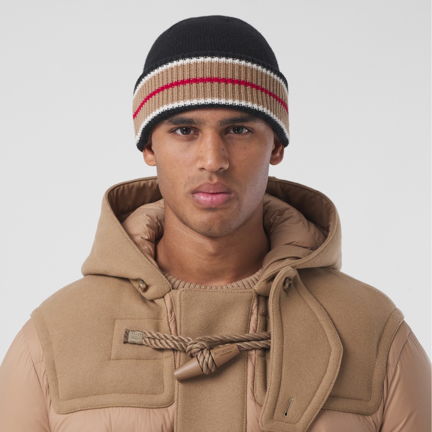 Reversible Icon Stripe Cashmere Cotton Beanie in Black camel Very well made.
